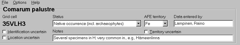 The distribution data files have the .afe extension and they are stored in the program directory. They are CSV files (comma separated value files). The values of the different variables are separated by commas and text variables are placed within quotation marks. The .afe files are created separately for each taxon. The first line contains the taxon name and other lines the distribution data for each grid cell in which the taxon has been recorded. An example for Fragaria viridis in Fe:
