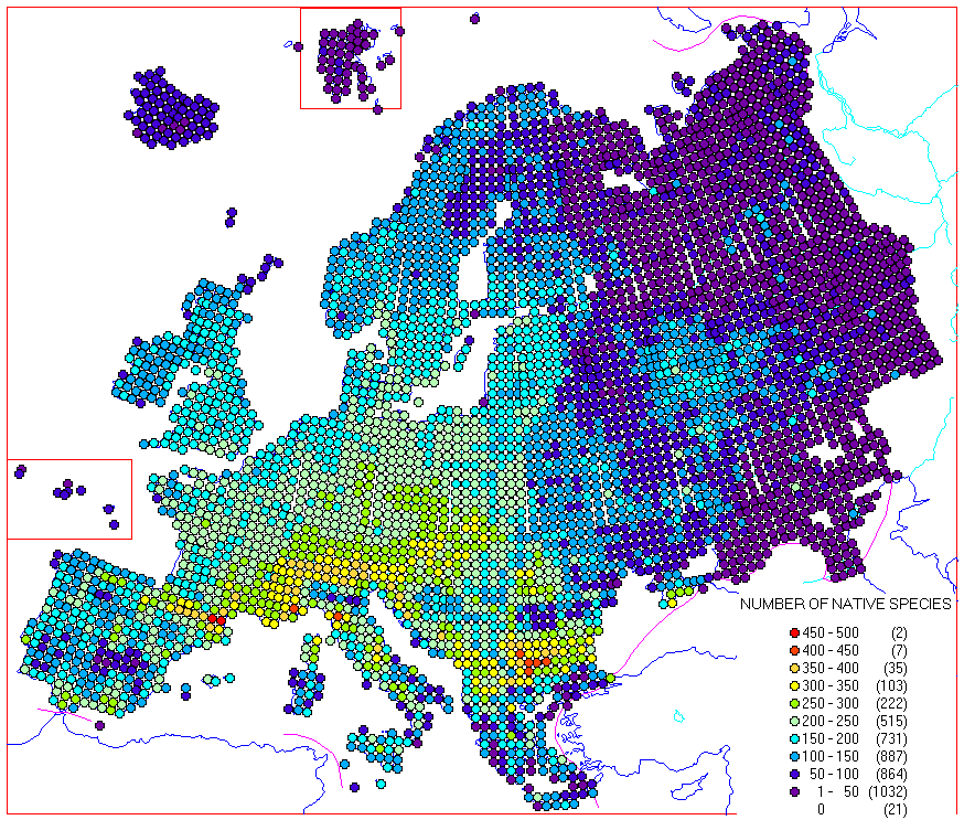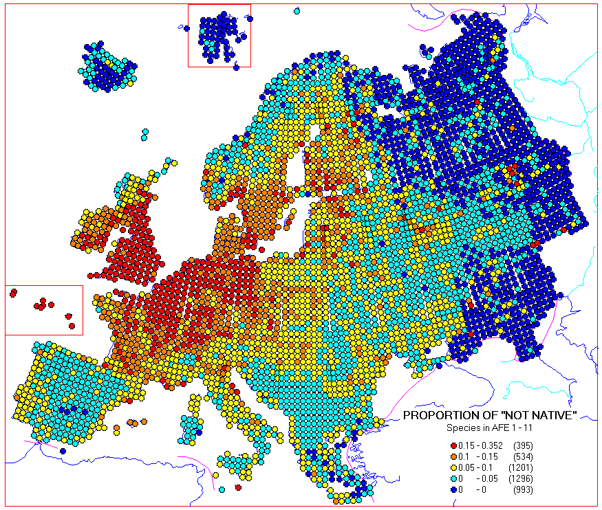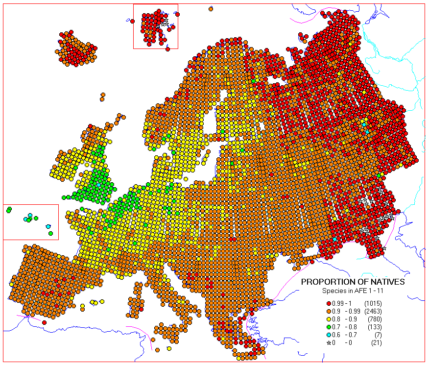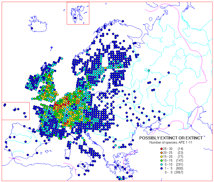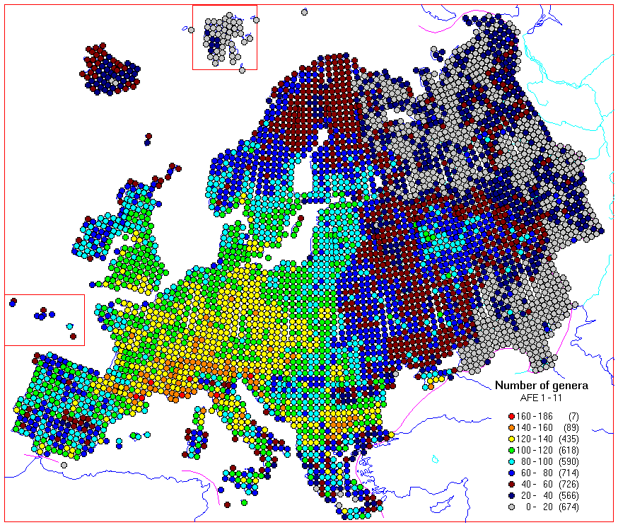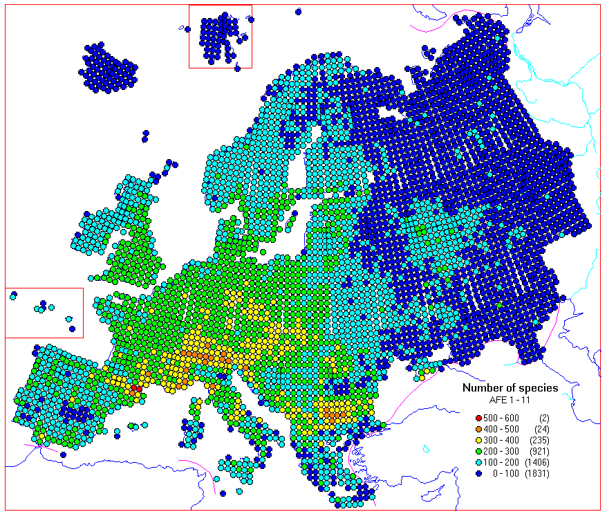 The maps included in already published volumes have been scanned to a database. Here are some example maps made from the database, calculated from the distribution maps in AFE 1 - 11 (at least 256 colour display needed to show the colours well enough):